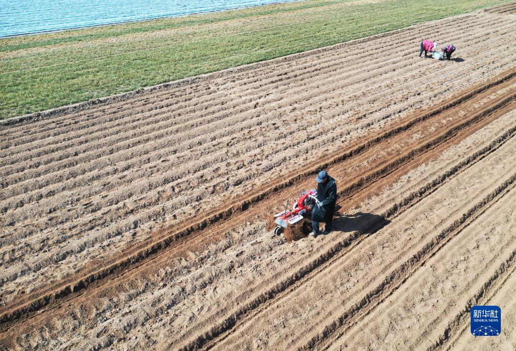 2月21日,山東省棗莊市山亭區桑村鎮農民在田間播種土豆(無(wú)人機照片)。