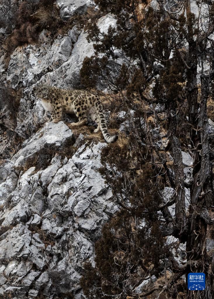2月21日,在青海省玉樹(shù)藏族自治州雜多縣昂賽鄉境內的昂賽大峽谷內,一只雪豹在向上攀爬。