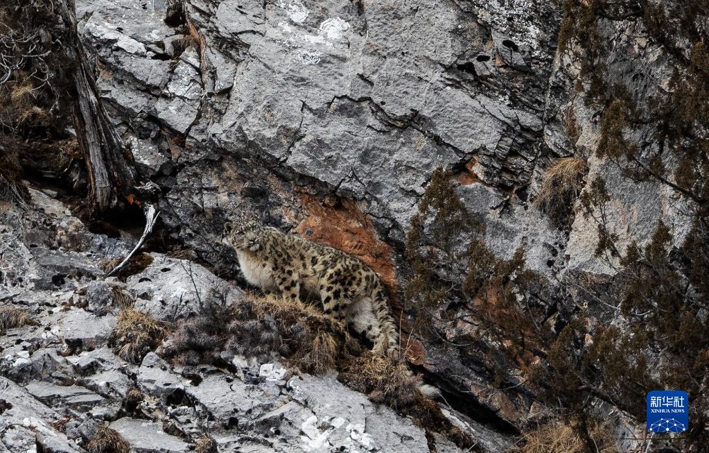 2月21日,在青海省玉樹(shù)藏族自治州雜多縣昂賽鄉境內的昂賽大峽谷內,一只雪豹準備向上攀爬。