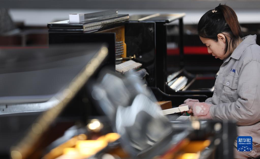 2月22日,工人在車(chē)間成品區內為成品鋼琴進(jìn)行出廠(chǎng)前調教。