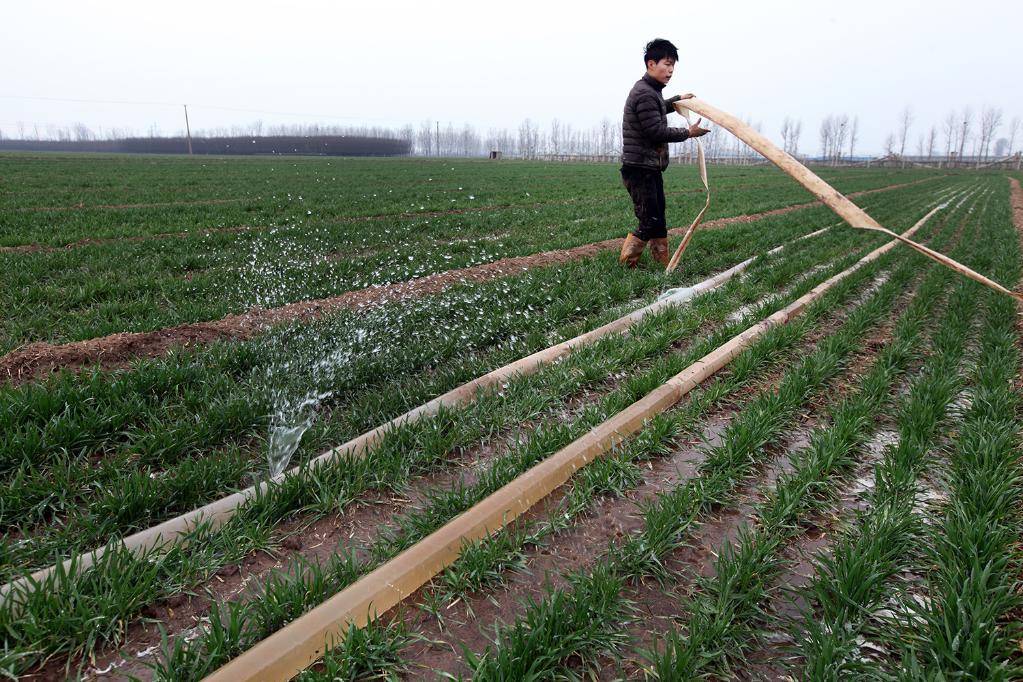 2月22日,河南省焦作市博愛(ài)縣金城鄉張茹集村村民在麥田澆水。