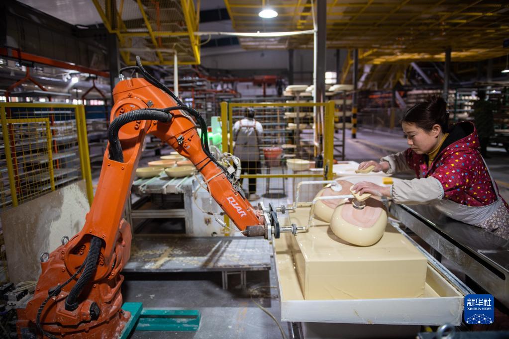 2月22日,在位于醴陵市的湖南華聯(lián)溢百利瓷業(yè)有限公司生產(chǎn)車(chē)間,工作人員在給瓷器上釉。
