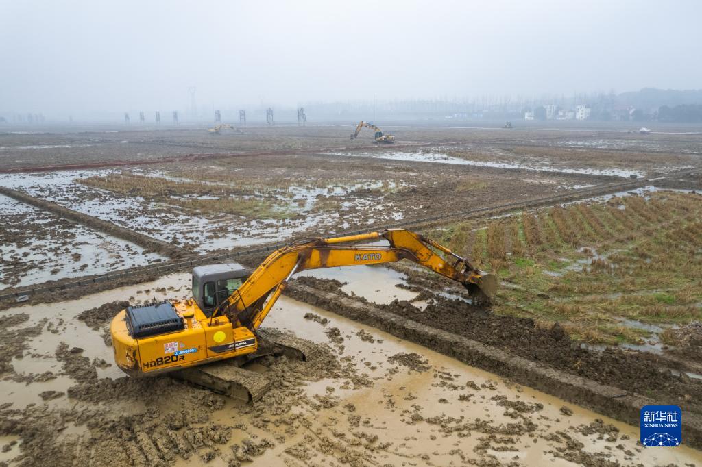 2月9日,在益陽(yáng)市赫山區筆架山鄉中塘村,村民進(jìn)行高標準農田建設施工(無(wú)人機照片)。新華社記者 陳思汗 攝