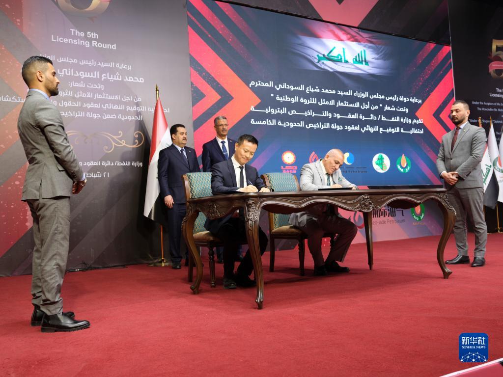 2月21日,伊拉克總理蘇達尼(后排左)在首都巴格達出席油氣田勘探與開(kāi)發(fā)協(xié)議的簽署儀式。