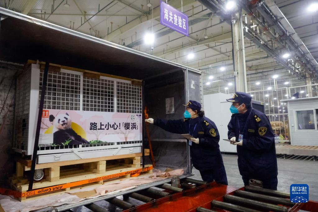 2月23日凌晨,在成都雙流機場(chǎng)海關(guān)的查驗區,海關(guān)工作人員在查驗運抵中國的大熊貓“櫻浜”。
