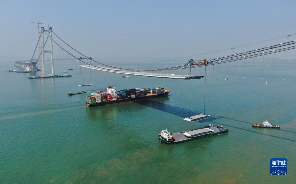 2月22日,集裝箱貨輪通過(guò)正在吊裝鋼箱梁的深中通道伶仃洋大橋(無(wú)人機照片)。