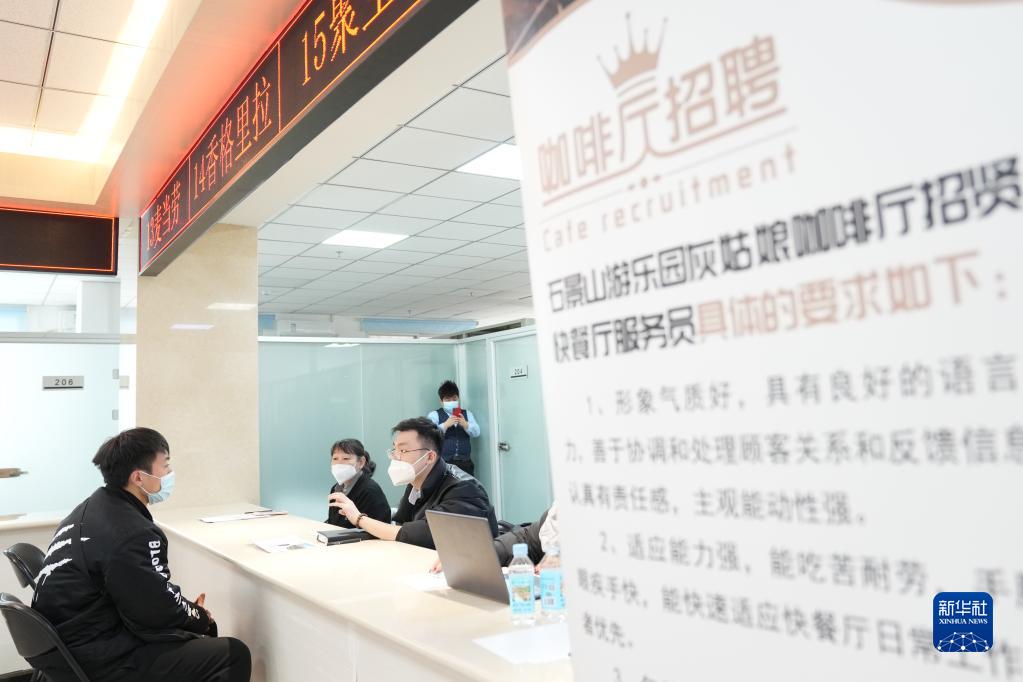 在北京市石景山區人力資源公共服務(wù)中心的春風(fēng)行動(dòng)酒店餐飲行業(yè)招聘專(zhuān)場(chǎng),一位求職者(左一)與企業(yè)招聘人員交流(2月21日攝)。