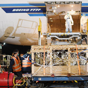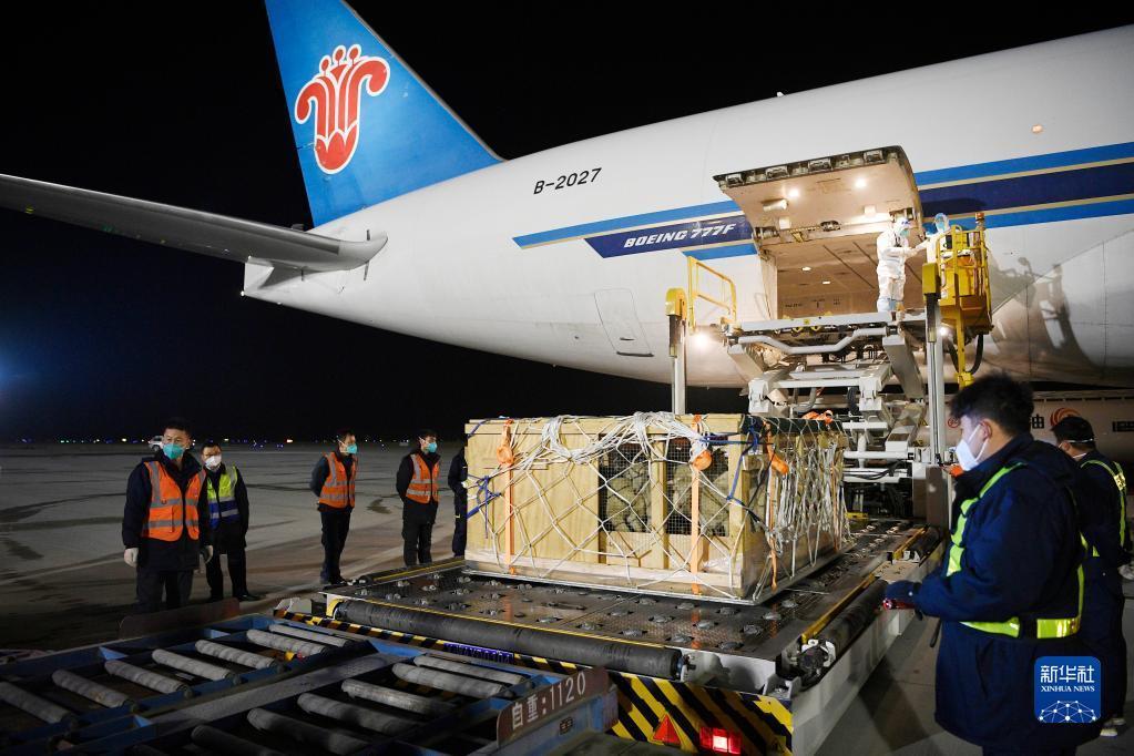 銀川河東國際機場(chǎng)工作人員對種羊進(jìn)行轉運(2月22日攝)。
