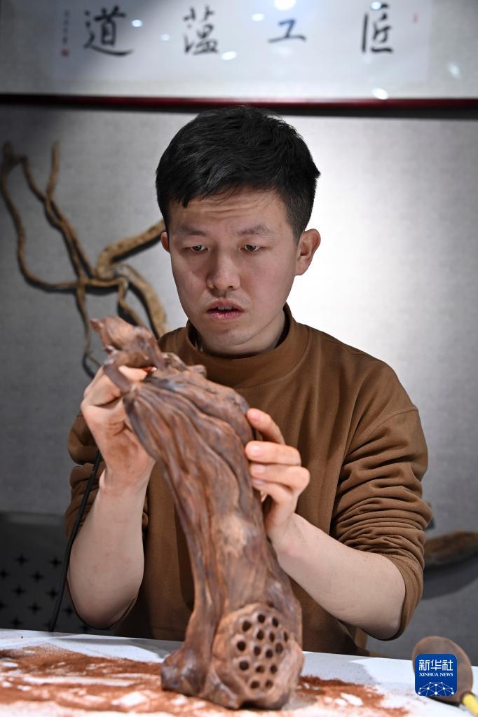 2月23日,手藝人在展覽現場(chǎng)展示晉作木雕技藝。