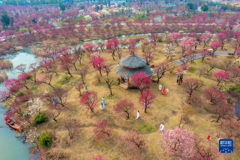 2月18日,游客在浙江省湖州市長(cháng)興縣龍之夢(mèng)東方盆景園賞梅(無(wú)人機照片)。