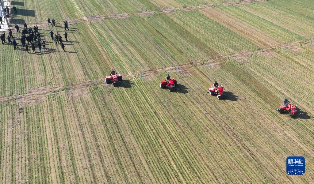 2月23日,在鄒平市長(cháng)山鎮八方農場(chǎng)活動(dòng)現場(chǎng),農機手進(jìn)行劃鋤式多功能麥苗鎮壓作業(yè)演示(無(wú)人機照片)。