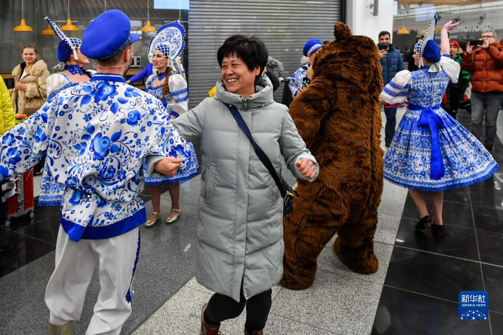 2月23日,在俄羅斯莫斯科的謝列梅捷沃機場(chǎng),中國游客在歡迎活動(dòng)中與工作人員跳舞。