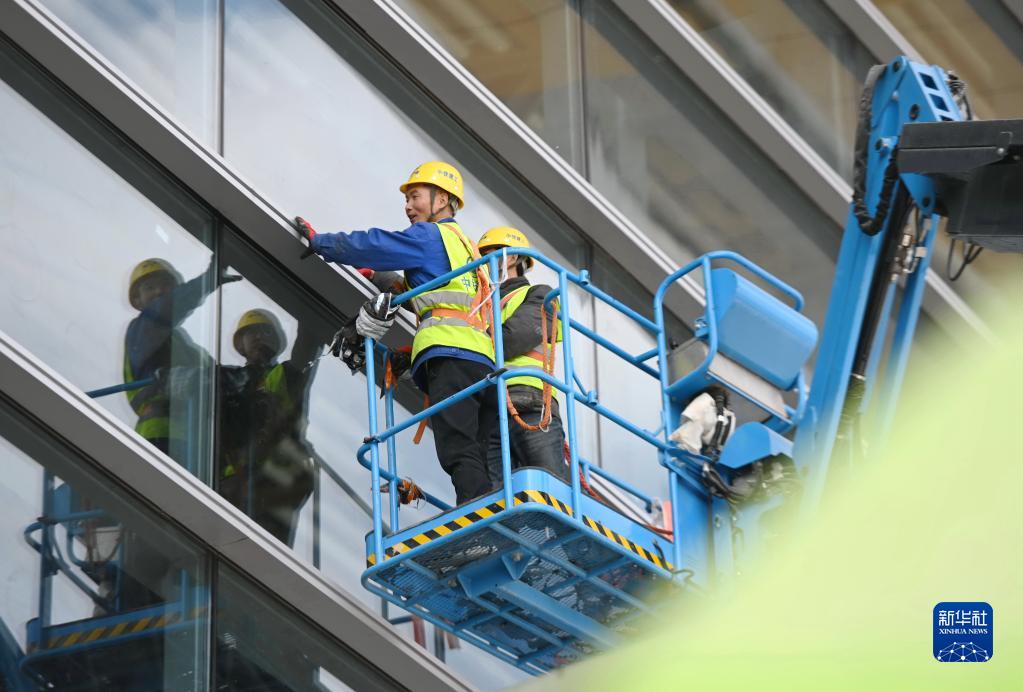 2月21日,中鐵建工集團有限公司施工人員在新建福廈鐵路福州南站安裝站房玻璃幕墻壓條。