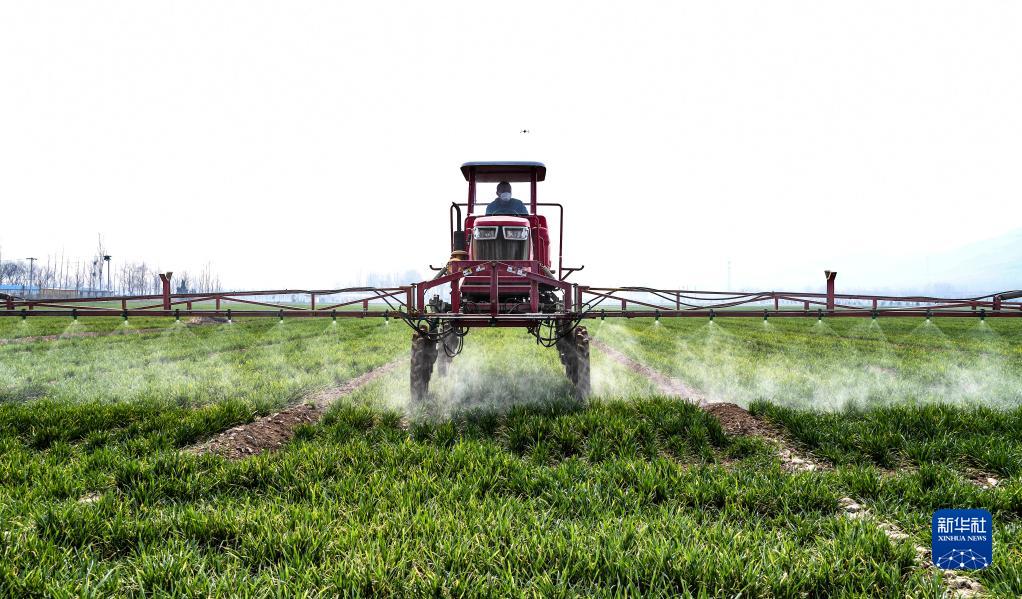 2月23日,河南省濟源市克井鎮酒務(wù)村農民駕駛農機在麥田噴灑農藥。