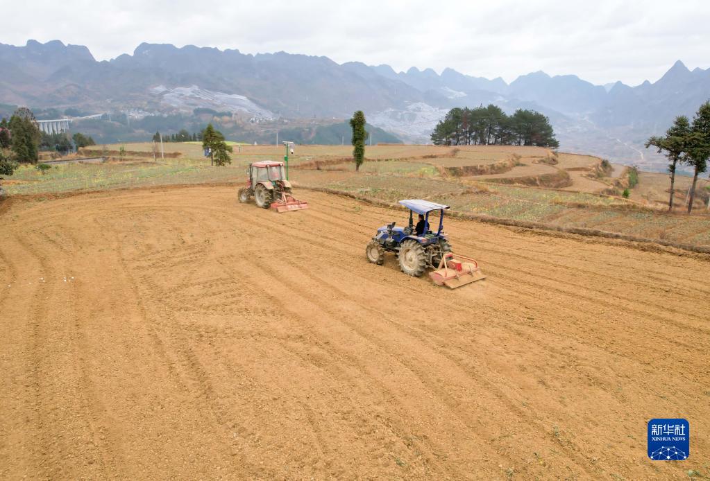 2月24日,在貴州省黔南布依族苗族自治州羅甸縣沫陽(yáng)鎮紅星村,農機手駕駛拖拉機在耕地(無(wú)人機照片)。