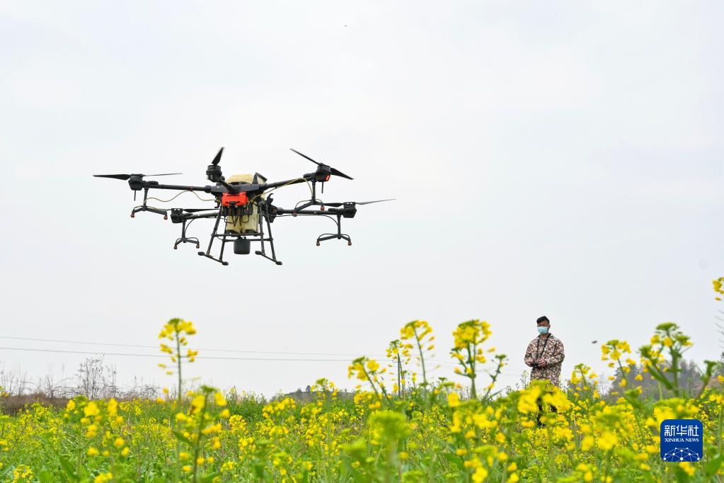 2月24日,在湖南省婁底市雙峰縣鎖石鎮車(chē)田村,農技人員利用植保無(wú)人機對油菜進(jìn)行病蟲(chóng)害防治和施肥作業(yè)。