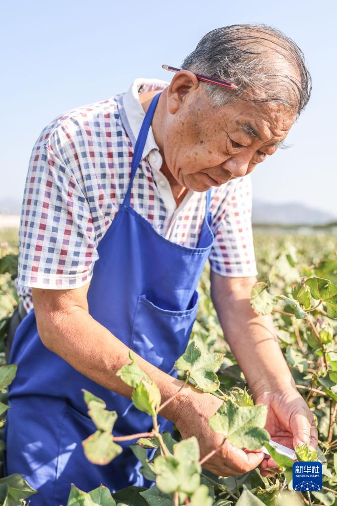 2月23日,在三亞的國家南繁科研育種基地里,棉花育種專(zhuān)家趙國忠在觀(guān)察棉花的長(cháng)勢。