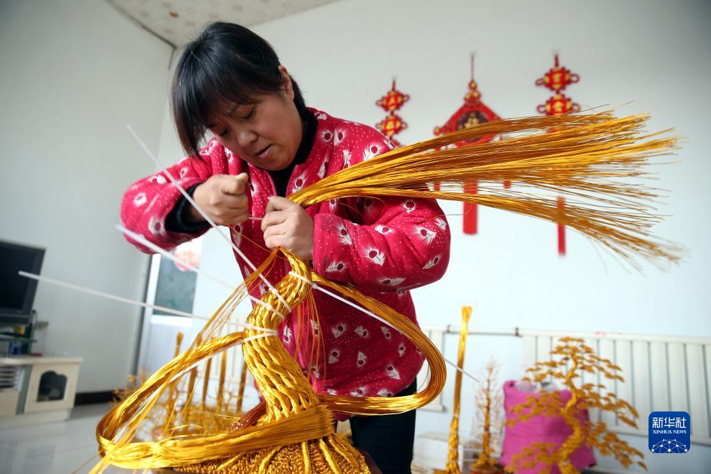 2月23日,濱州市沾化區下洼鎮村民王煥娥在家編織鋁絲工藝品。
