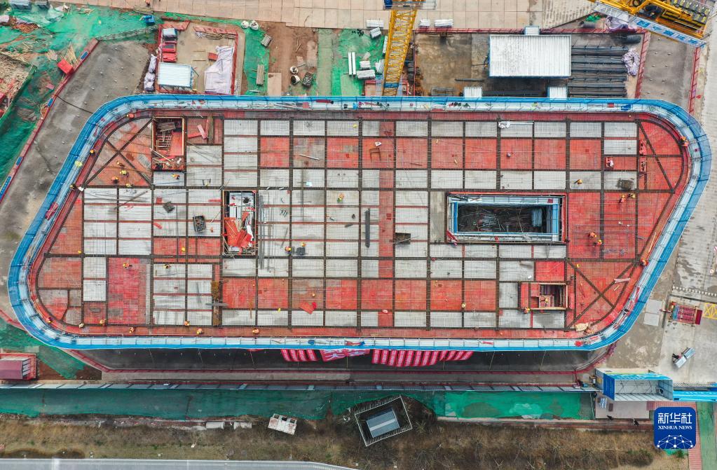 2月24日,在位于成都東部新區的四川大學(xué)華西東部醫院項目建設現場(chǎng),工人在進(jìn)行封頂施工作業(yè)(無(wú)人機照片)。
