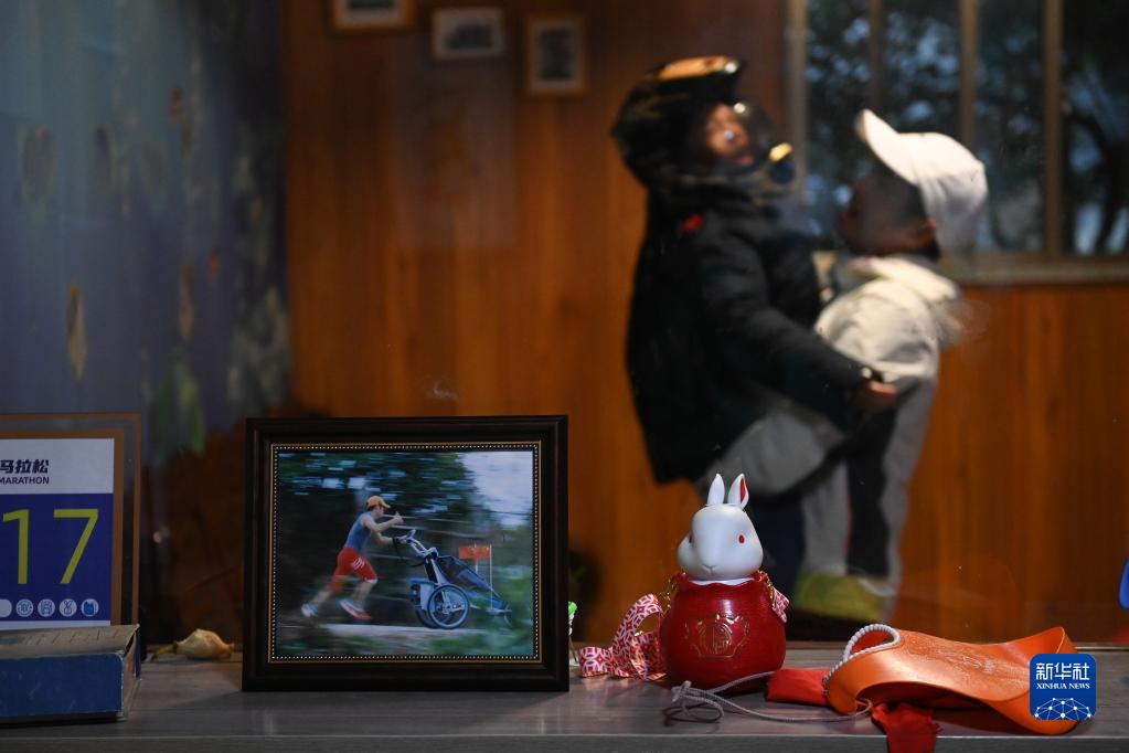 2月24日,羅書(shū)堅(右)將兒子小柏抱至房間。目前,因并發(fā)癲癇,小柏不適合參加康復治療,日常在家戴著(zhù)頭盔,由爺爺奶奶看護。