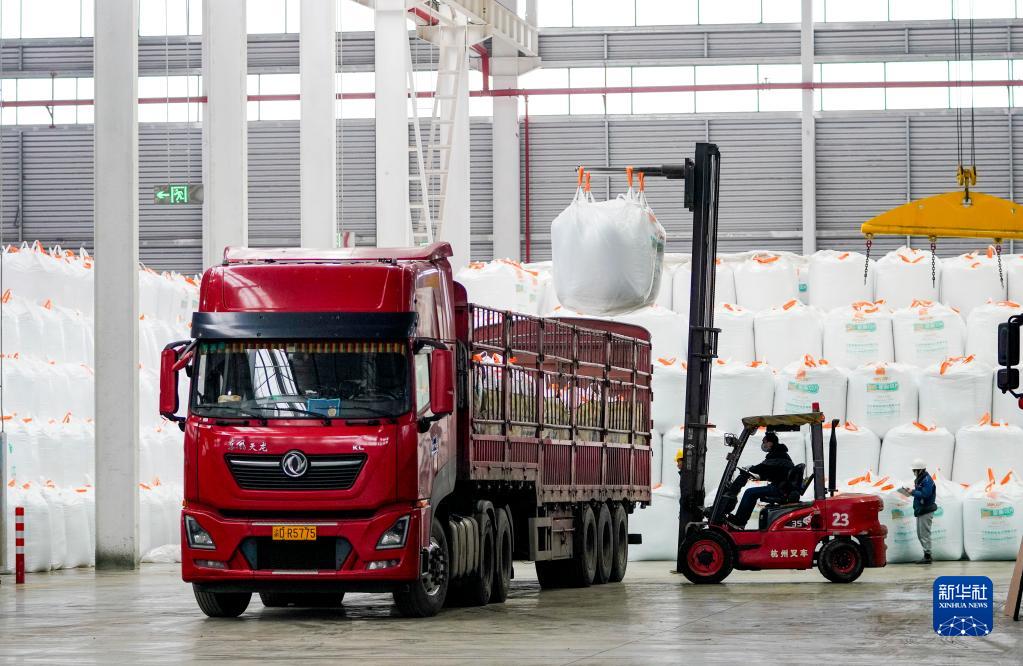 2月21日,在重慶萬(wàn)凱新材料科技有限公司成品庫房,工人操作機械設備將產(chǎn)品裝上貨車(chē)。