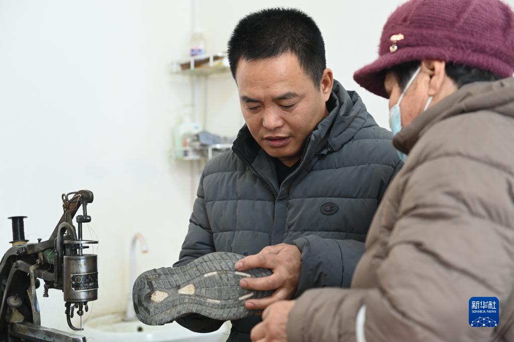 2月23日,在咸陽(yáng)市秦都區錦華社區小濱工坊,殘疾修鞋匠李斌(左)接待顧客。