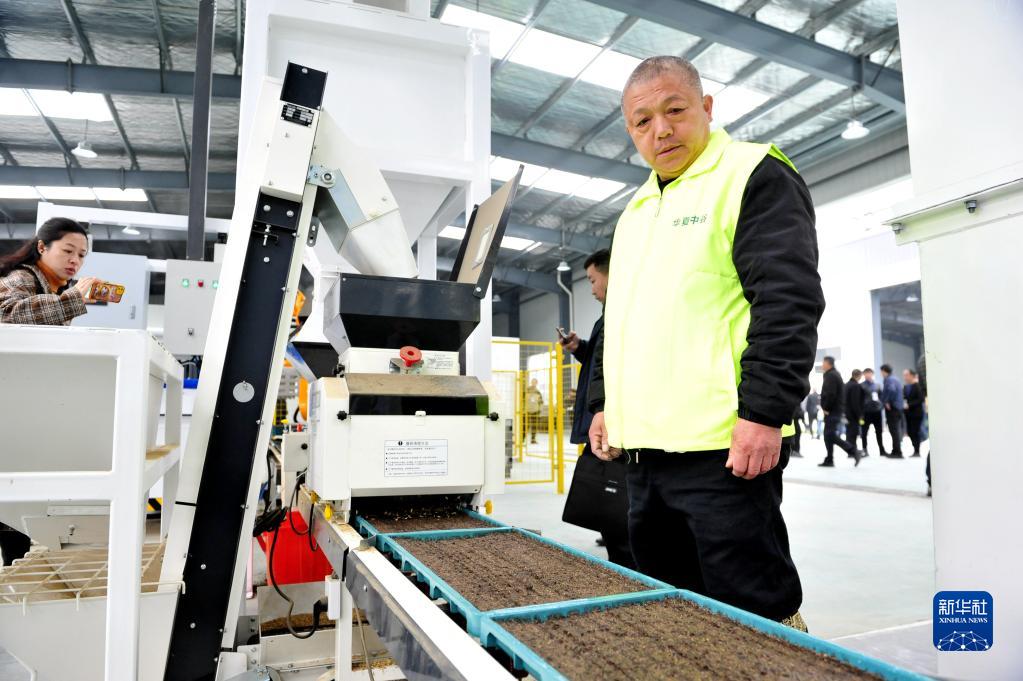 2月24日,在涇口鄉工廠(chǎng)化智能育秧中心,工作人員查看流水線(xiàn)上的秧盤(pán)。