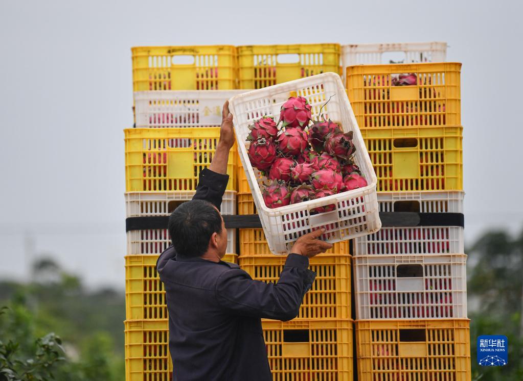 農戶(hù)在海南省儋州市中和鎮轉運采收的火龍果(2月24日攝)。