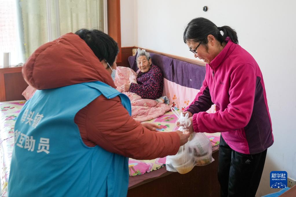 2月25日,威海市文登區澤頭鎮北莊村睦鄰互助員為因病臥床的于秀英老人送餐。