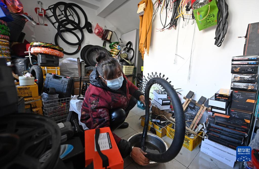 在中新天津生態(tài)城第三社區中心,一家自行車(chē)修理店經(jīng)營(yíng)者正在為顧客檢查輪胎(2月24日攝)。