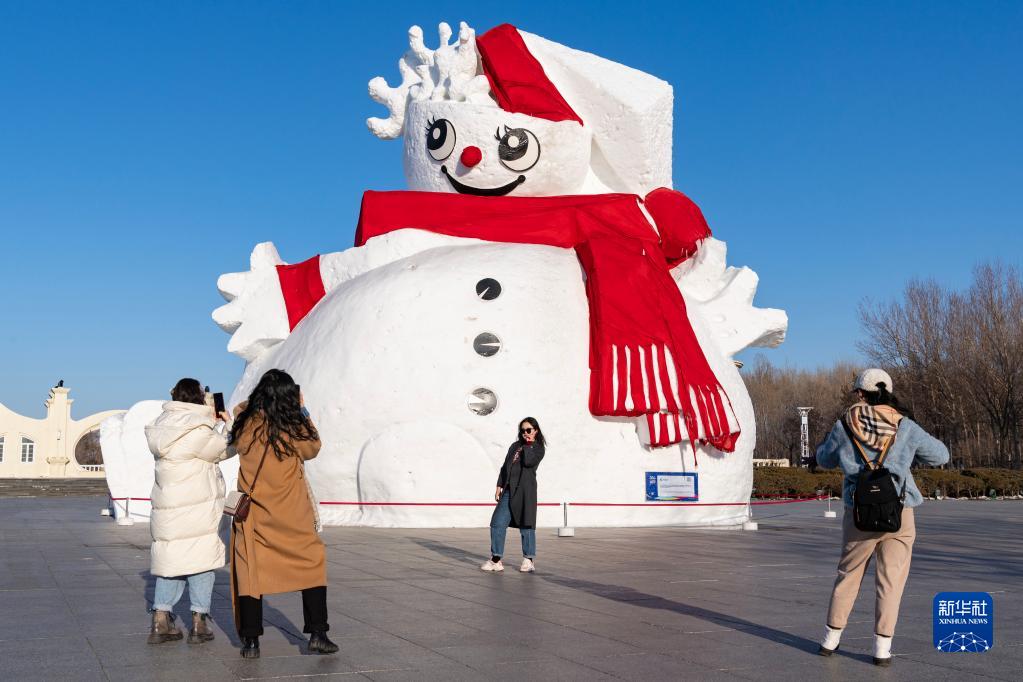 2月25日,游客在哈爾濱太陽(yáng)島雪博會(huì )入口的雪塑前拍照。
