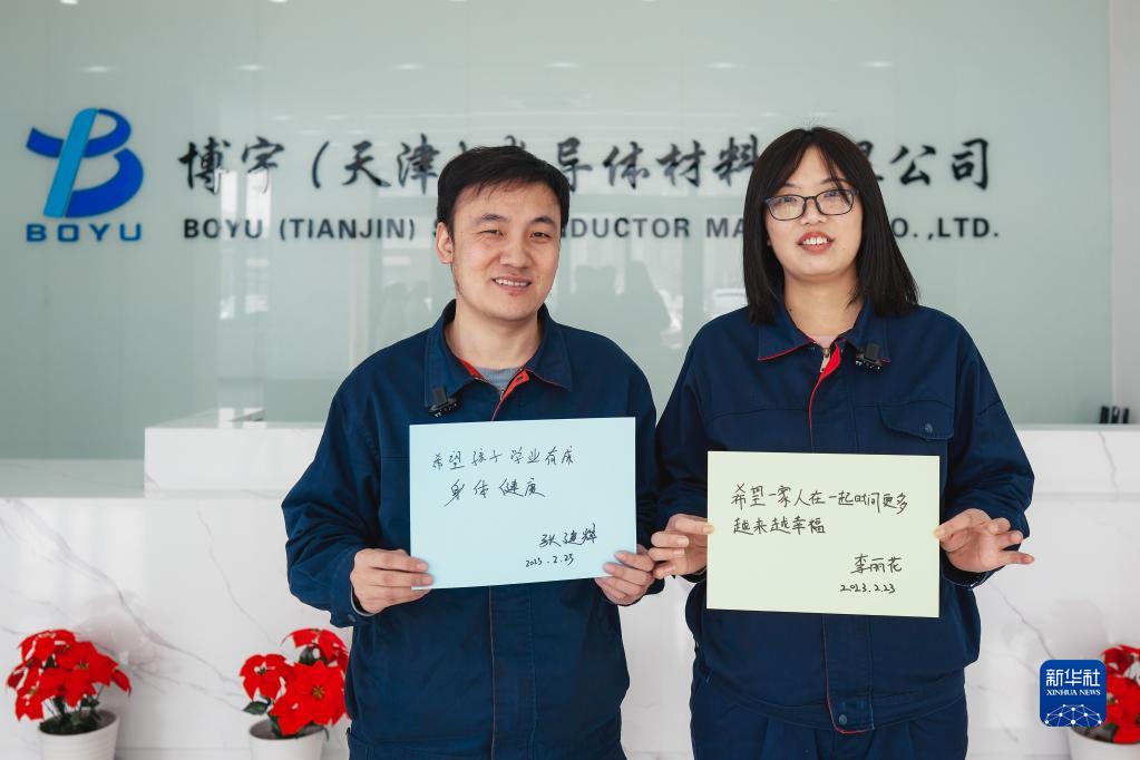 在博宇(天津)半導體材料有限公司,張建輝(左)和李麗花展示他們寫(xiě)下的心愿(2月23日攝)?!?5后”夫妻張建輝和李麗花曾在北京打拼多年,二人目前同在博宇(天津)半導體材料有限公司從事生產(chǎn)工作。2020年,他們落戶(hù)天津寶坻京津中關(guān)村科技城,并在配套的中關(guān)村創(chuàng )新人才社區居住,孩子也從山東老家接來(lái)身邊上學(xué),一家三口實(shí)現了同城生活。張建輝希望孩子學(xué)業(yè)有成、身體健康,李麗花希望一家人在一起的時(shí)間更多、越來(lái)越幸福。