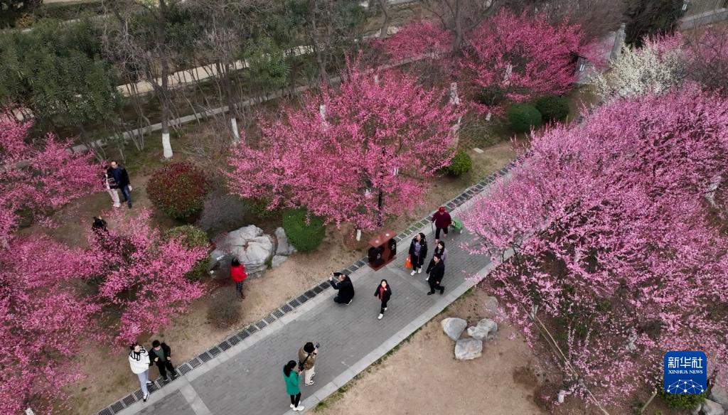 2月25日,市民在湖北省襄陽(yáng)市峴山文化廣場(chǎng)賞花游玩(無(wú)人機照片)。