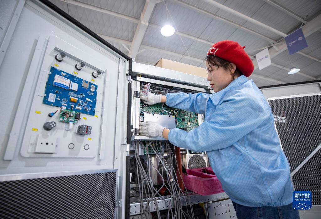在位于寧夏同心工業(yè)園區清潔能源產(chǎn)業(yè)園的上能電氣(寧夏)有限公司車(chē)間內,工人為逆變器布置電纜走線(xiàn)(2月23日攝)。