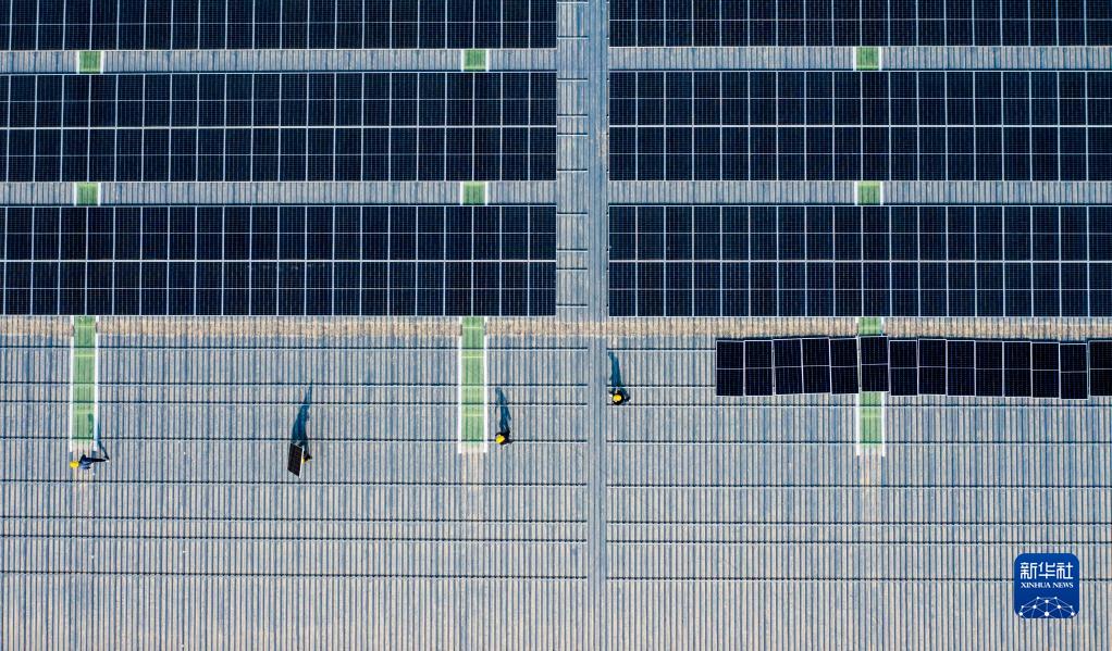 在位于寧夏同心工業(yè)園區清潔能源產(chǎn)業(yè)園的英利新能源(寧夏)有限公司生產(chǎn)車(chē)間屋頂,工作人員在安裝光伏發(fā)電板(2月23日攝,無(wú)人機照片)。