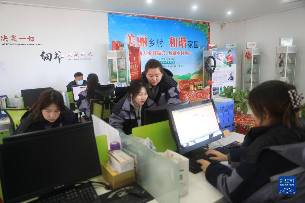 2月20日,在遼寧省朝陽(yáng)市朝陽(yáng)縣木頭城子鎮十家子村,王穎在村里的電子商務(wù)公司和大家一起工作。
