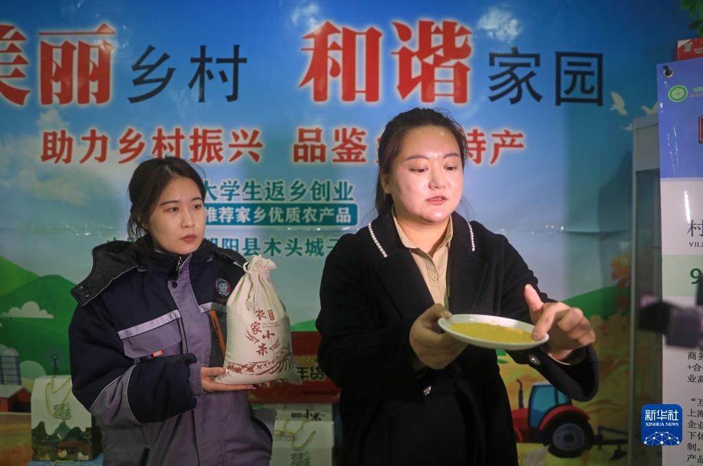 2月20日,在遼寧省朝陽(yáng)市朝陽(yáng)縣木頭城子鎮十家子村,王穎(右)和在村里電子商務(wù)公司工作的大學(xué)生一起直播賣(mài)貨。