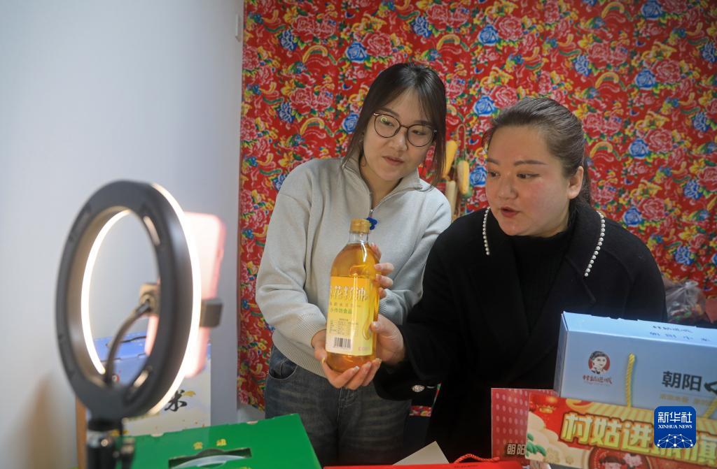 2月21日,在遼寧省朝陽(yáng)市“村姑進(jìn)城”實(shí)體店,王穎(右)和大學(xué)生一起直播賣(mài)貨。