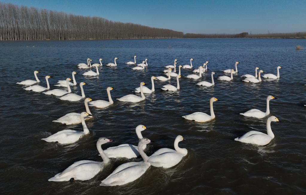 2月25日,天鵝在曹妃甸濕地水面上游弋。