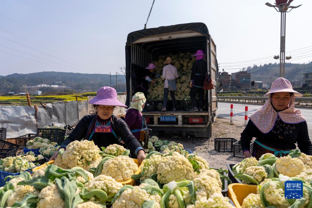 2月26日,在貴州省從江縣貫洞鎮貫洞村松花菜種植基地,菜農將剛采摘的松花菜裝車(chē)。