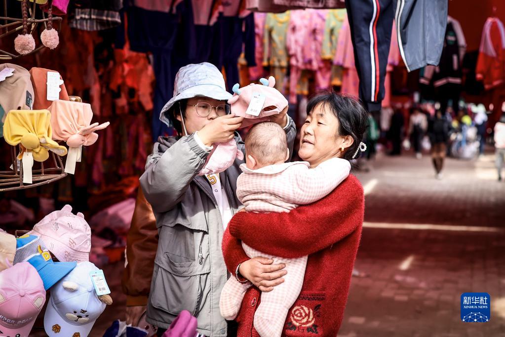 2月26日,在托克扎克鎮農貿市場(chǎng),一名女士在給孩子挑選帽子。
