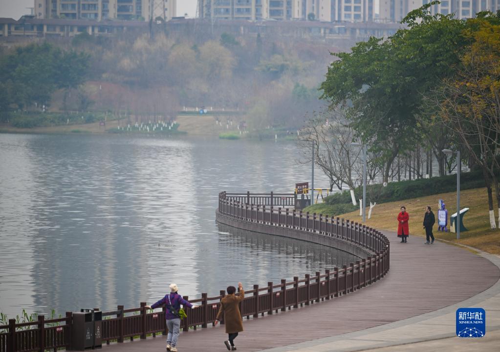 市民在眉山市仁壽縣城市濕地公園散步休閑(2月26日攝)。
