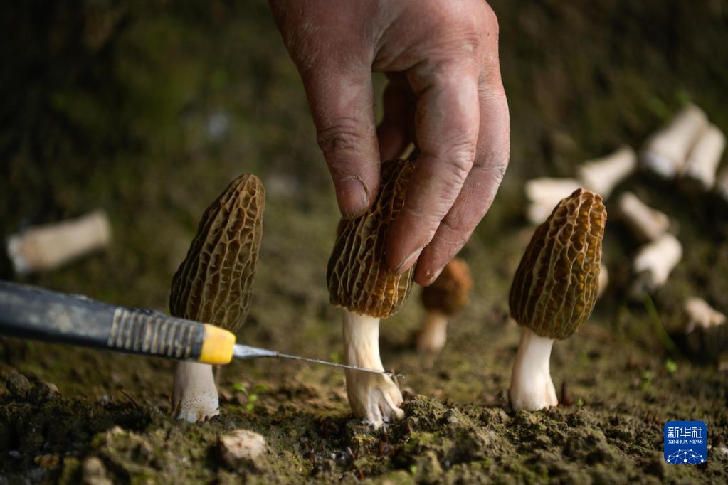 2月27日,農民在貴州省天柱縣鳳城街道羊肚菌示范基地采收羊肚菌。