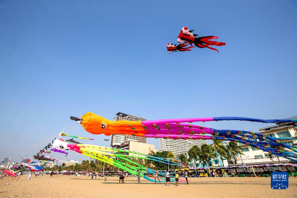 這是2月27日在泰國芭提雅海灘拍攝的大型風(fēng)箏。泰國芭提雅近日舉辦海灘風(fēng)箏節。