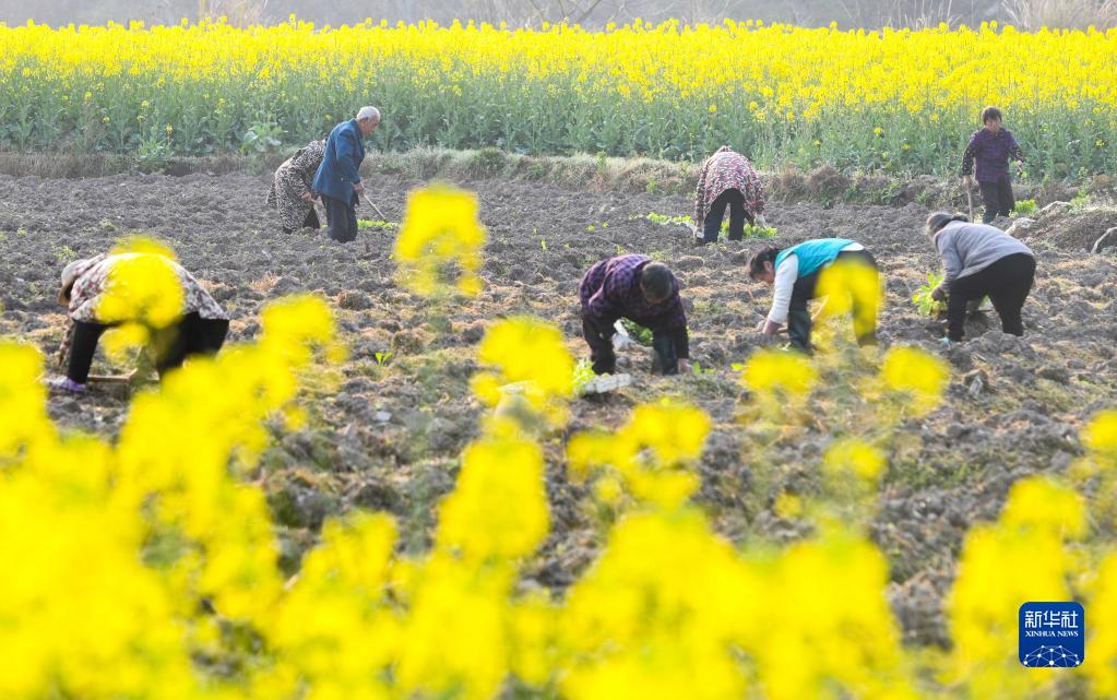 2月28日,湖南省永州市道縣清塘鎮達村,農民在移栽農作物幼苗。