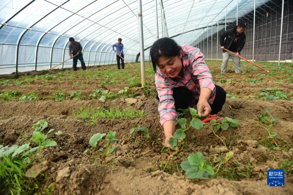 2月28日,在河北滄縣劉家廟鄉劉浩屯村果品生產(chǎn)基地,農戶(hù)在大棚內進(jìn)行甜瓜除草工作。
