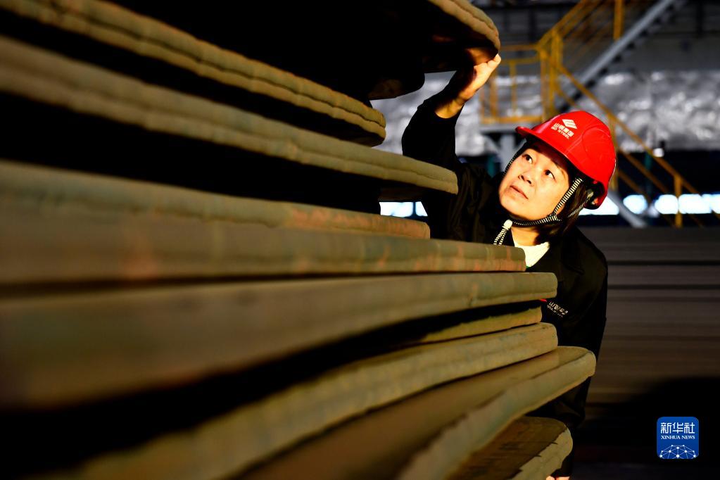 在山鋼集團日照公司生產(chǎn)車(chē)間,胡淑娥在查看鋼板質(zhì)量情況(2月16日攝)。