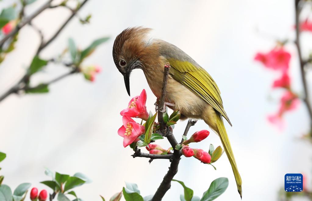 2月27日,在四川省達州市通川區大寨子公園,一只綠翅短腳鵯在花枝上停歇。