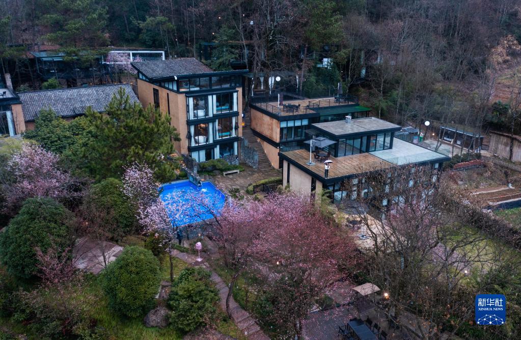 2月28日拍攝的三都鎮前源村山頂一家被櫻花樹(shù)包圍的民宿(無(wú)人機照片)。
