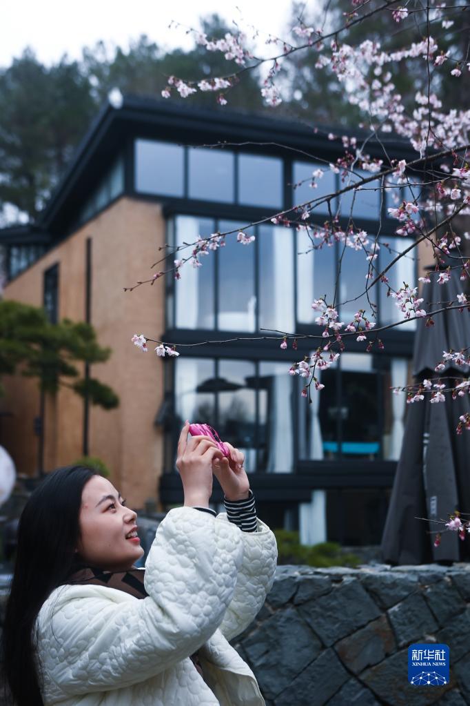 2月28日,游客在三都鎮前源村山頂的一家民宿觀(guān)賞櫻花。